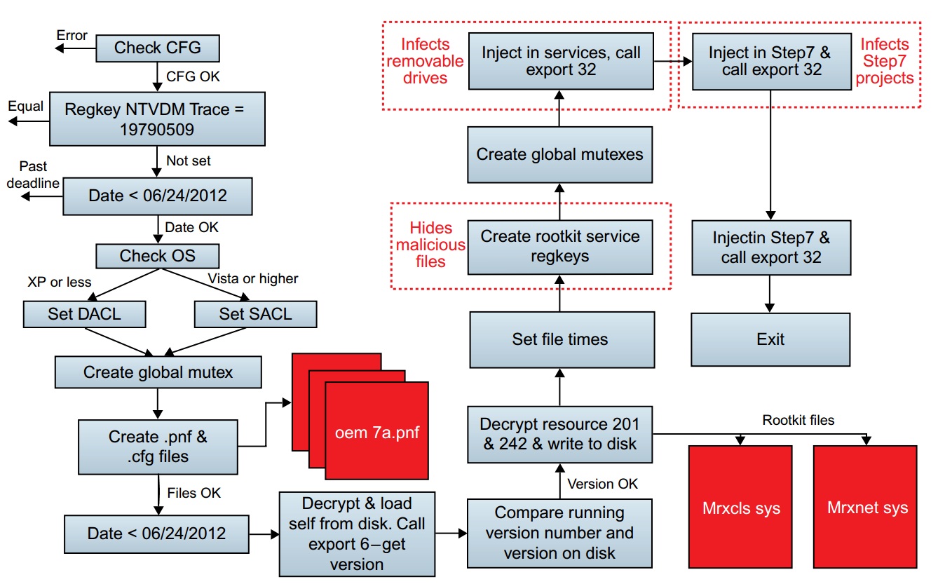هرچند stuxnet برای اولین بار در ژوئن 2009 مشاهده شد، تا تابستان 2010 که سازمان ICS-CERT درباره آن هشدار دهد، در مقابل آن مقابله جدید انجام نشده بود. این ویروس از چهار نوع حمله zero-day برای آلوده کردن و پخش شدن استفاده میکند. این ویروس ابتدا به دنبال برنامه های simatic WINCC و PCS7 که توسط شرکت simens توسعه پیدا کردهاند میگردد، سپس از مجوز اکانت پیش فرض sql برای سرایت کردن به plc های مرتبط با آن، به روش تزریق کد استفاده میکند. این تزریق کد از طریق پروتکل fieldbus شرکت simens انجام میگیرد. در مرحله بعد، stuxnet به دنبال ابزارهای اتوماسیون که وظیفه کنترل سرعت موتورها را دارند میگردد. اگر کنترلی پیدا شد که در محدوده 800-1200hz باشد، تلاش میکند تا خرابکاری انجام دهد.